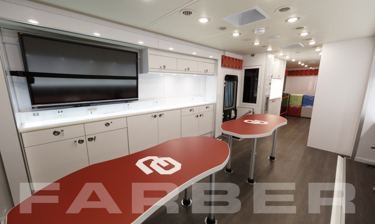 Vehicle number 17446 is a Mobile STEM Lab vehicle designed by Farber Specialty Vehicles and built for Oklahoma University on a Freightliner coach chassis. Farber is here to help you with a custom solution to all your specialty vehicle needs. Call us today at (800) 331-3188.