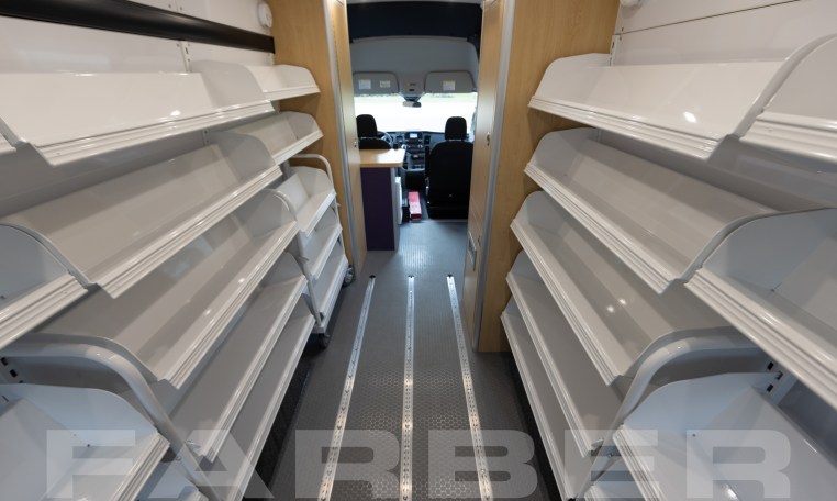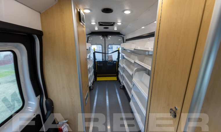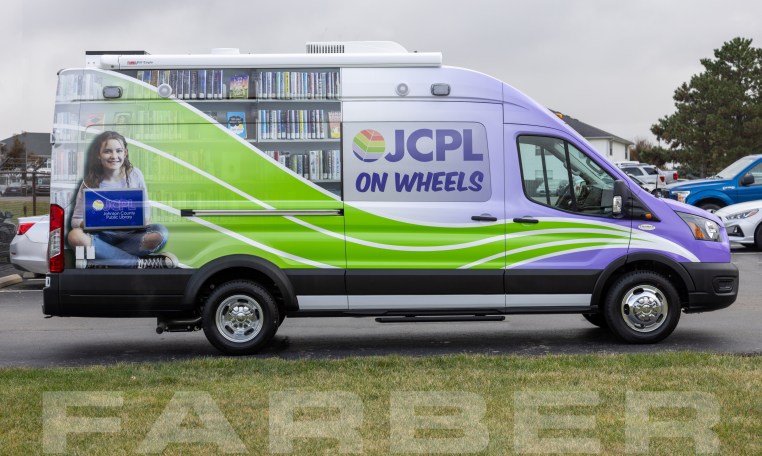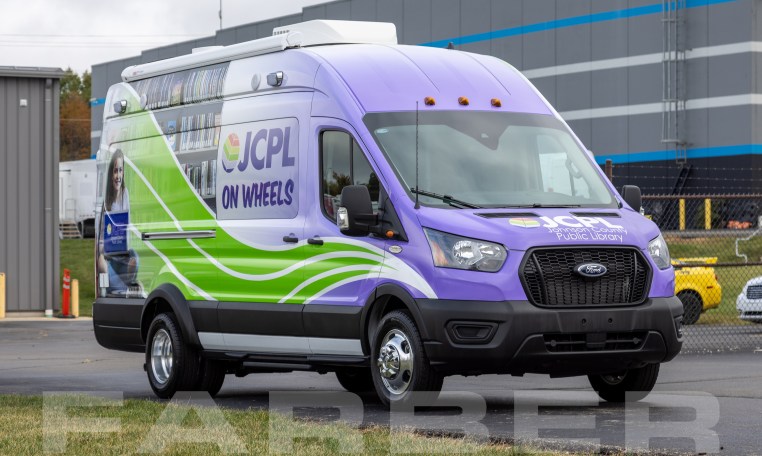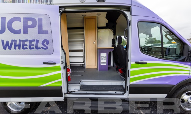 Vehicle number 17572 is a Bookmobile designed by Farber Specialty Vehicles and built for Johnson County Public Library on a Ford Transit chassis. Farber is here to help you with a custom solution to all your specialty vehicle needs. Call us today at (800) 331-3188.