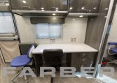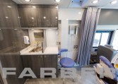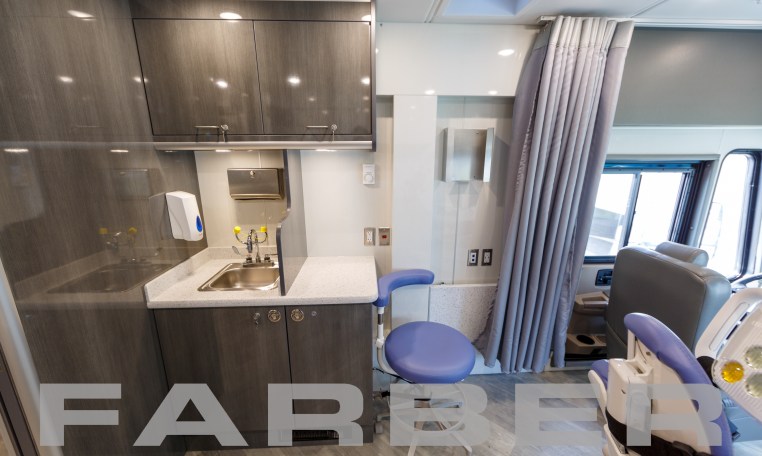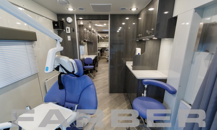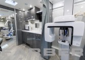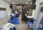 Mobile Dental Coach 41′ 4″, 8.3L, Cummins 400HP, diesel powered, rear engine, 33,000 GVWR, Allison 6-speed automatic, 20kW commercial generator, 150 gal fuel tank, full air-suspension, air disc brakes, independent front suspension, 101 exterior width, aluminum frame body construction, fiberglass exterior, flat interior floor, no wheel wells, electric steps, aluminum outer wheels. Built-in dash monitor for rearview camera system. Three roof AC, electric heat, leveling/stabilizing system, magnetic/hydraulic 12V circuit breakers, disconnect switches for main and auxiliary battery system, 90 amp converter, 36 shoreline. Custom cabinets cut using CNC router. Space is designed for efficiency and ergonomic function in an optimized workflow. Floor plan includes two operatories, intake/reception area, waiting area and sterilization center. Custom options for restroom, ADA accessibility, additional entrances and awnings. Dental chairs, X-rays, sterilization and other dental equipment available.