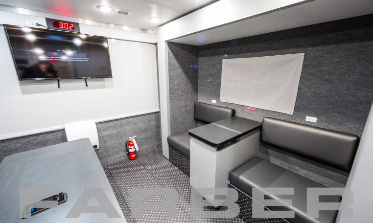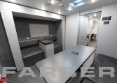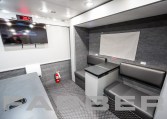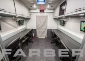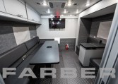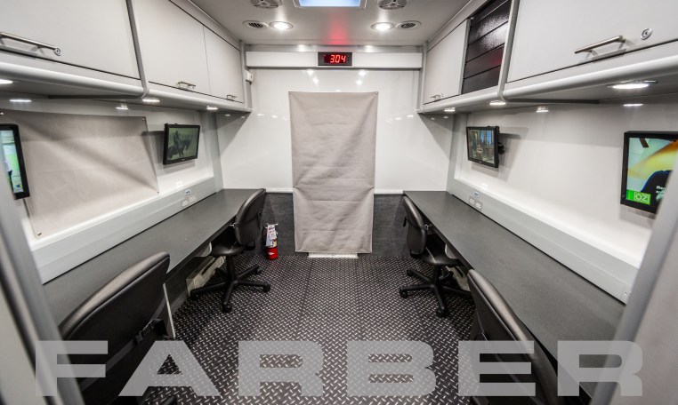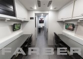 Command/Communications/EOD Vehicle 33′, 260HP diesel engine, 26,000 GVWR, Allison 3000 EVS automatic 6 speed, 60 gallon fuel tank. 12kW diesel powered generator, two air conditioners, interior and exterior LED light package, scene lights. Magnetic/hydraulic 12V and 120V circuit breakers, electronic master disconnect switches for main and auxiliary battery system, 36 shoreline. Four workstations, conference room, galley with under counter refrigerator, coffee maker and microwave. Custom cabinets cut using CNC router.