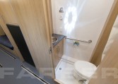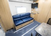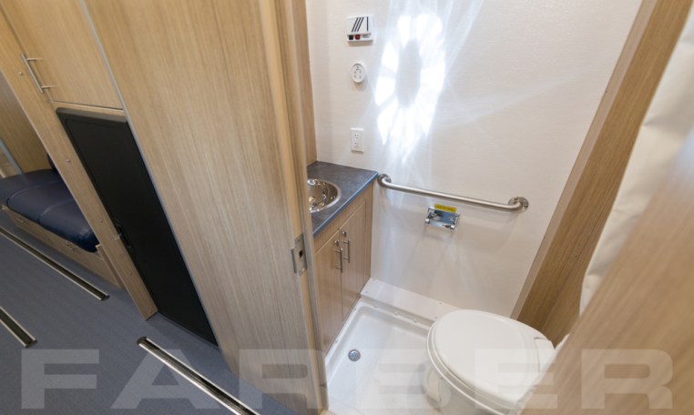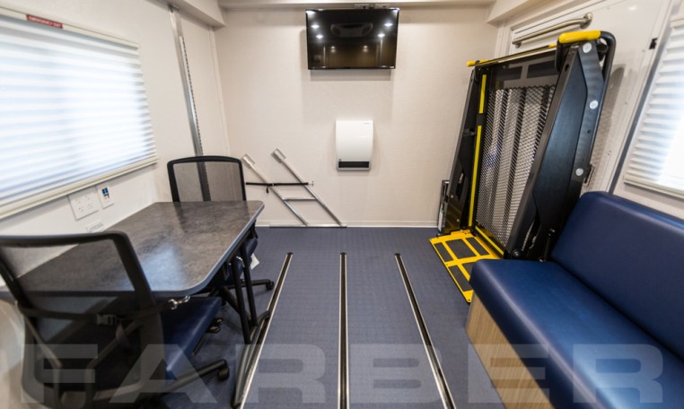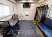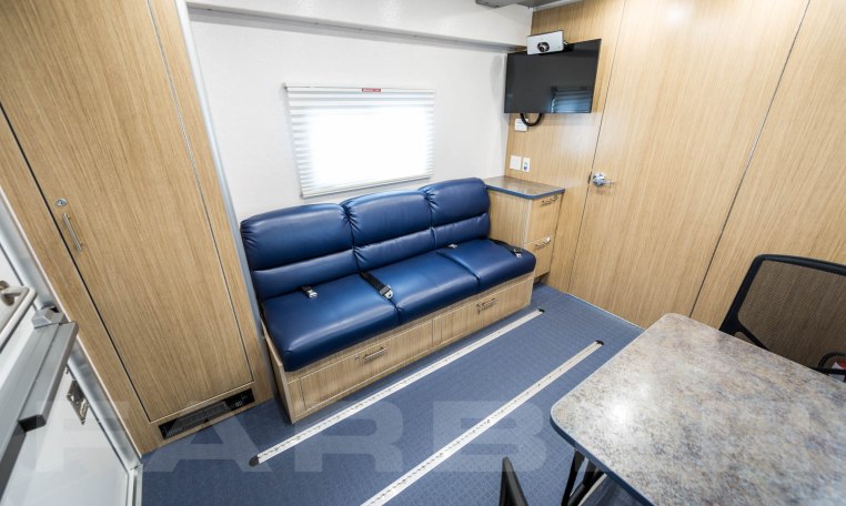 34′ overall length, medium duty chassis, 26,000-29,000 GVWR, Cummins ISB 260 HP engine, Allison automatic transmission, dual 50 gallon fuel tanks, rear air suspension. Power heated mirrors, power door locks, power steering, cruise control, tilt steering, automotive air conditioning, air suspension driver and passenger seats, air horn. Custom aluminum body, 102 wide, flat interior floor, double insulation, FRP finished interior walls. Onan Quiet 12Kw diesel generator, dual roof air conditioners, shoreline power, electric forced air heat. Custom cabinetry constructed of lite plywood meeting CARB certifications. All laminate meets FMVSS and CMVSO 302 flammability, bonded to plywood using hot press under pressure of 3,000 pounds minimum. Custom floorplan including cabinetry, jack knife sofa, file cabinets w/combination locks, removable table w/office style chairs.