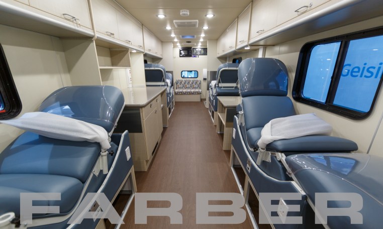 Bloodmobile Vehicle 39′, 325HP diesel engine, 33,000 GVWR, Allison 3000 RDS automatic 6 speed, air brake package, 60 gallon fuel tank. 12kW diesel powered generator, three air conditioners, group 31 deep-cycle batteries, magnetic/hydraulic 12V circuit breakers, electronic master disconnect switches for main and auxiliary battery system, 36 shoreline. Commercial / medical grade vinyl flooring. Electric heat, automatic computerized hydraulic leveling/stabilizing system, magnetic/hydraulic 12V circuitbreakers, electronic master disconnect switches for main and auxiliary battery system, 90 amp. converter, 36 shoreline. Custom cabinets cut using CNC router. Space is designed for efficiency and ergonomic function in an optimized workflow. Floorplan includes four blood draw tables, screening room(s), waiting area and lab area. Custom options for restroom, additional entrances and awnings. See price sheet for details. Alternative length options available.