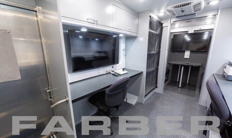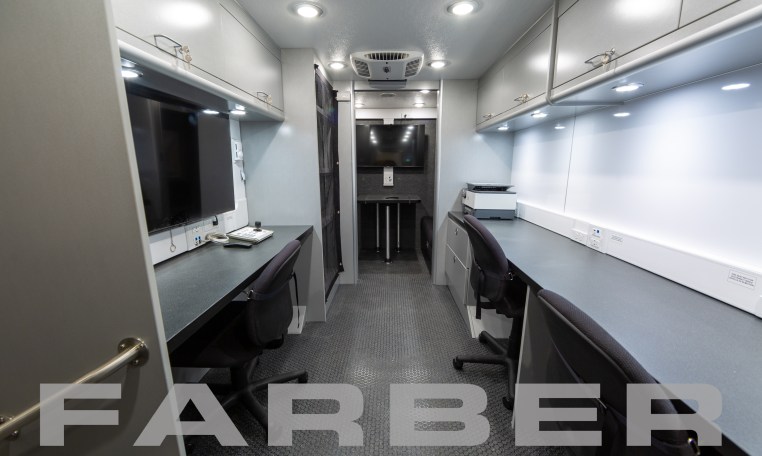 Mobile Command, Mobile Command Post, 25’6″ Ford E-450 Super Duty, 14,050 GVWR, 6.8L Triton V-10, automatic transmission, anti-lock brakes, 55 gallon fuel tank, tilt power steering wheel, cab air conditioning, AM/FM stereo, captain high back seats 7.0kW gasoline powered generator, 13,000 BTU air conditioner with 5,600 BTU heat strip. All vehicles delivered with as built interior and exterior AutoCAD drawings. Complete wiring schematics provided with each Mobile Command Post Vehicle.