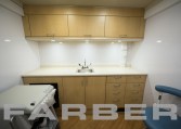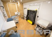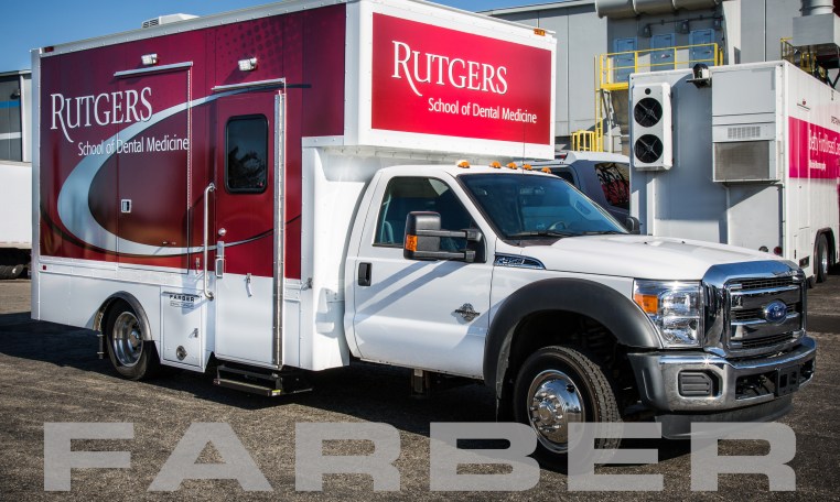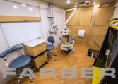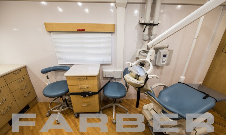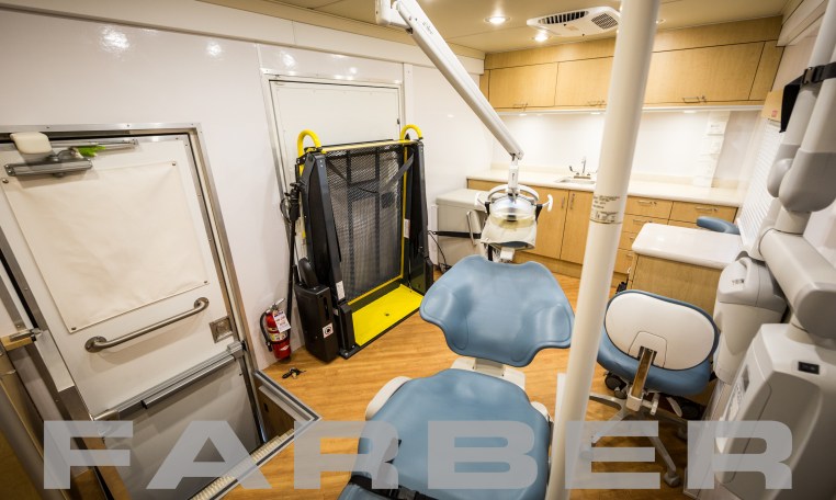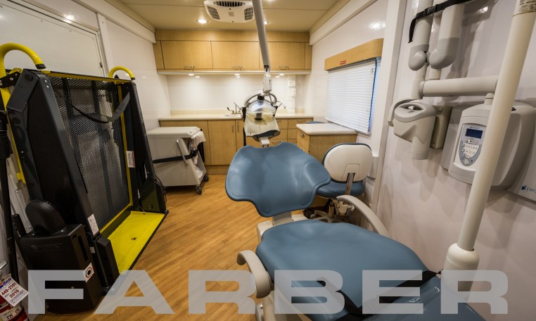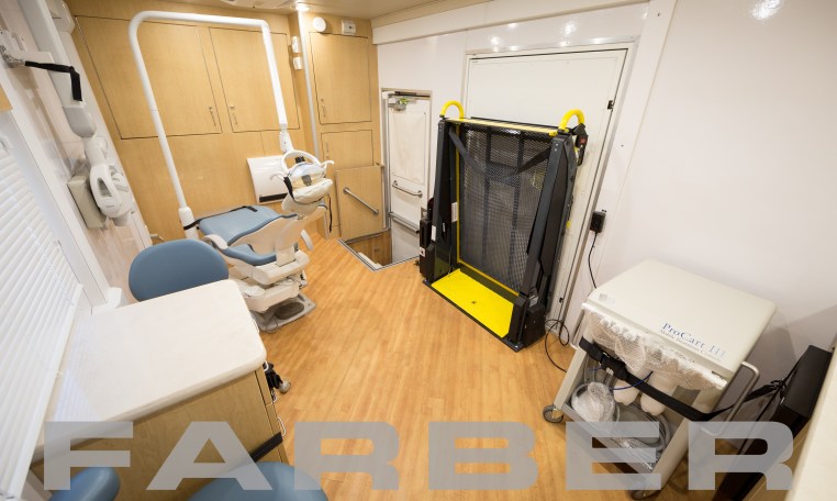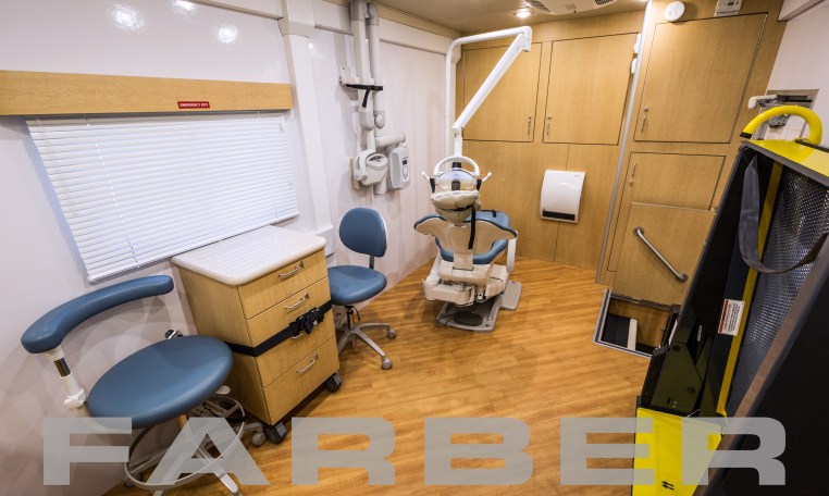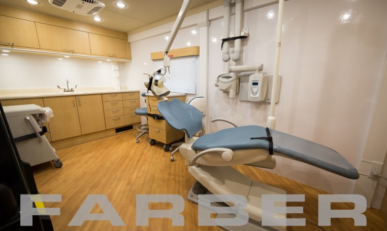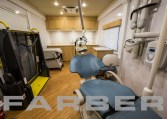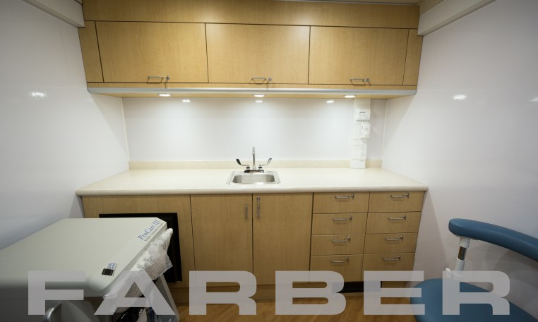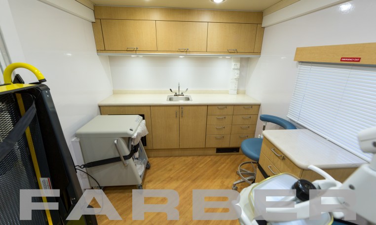 Mobile Dental Vehicle 27′, 6.7L diesel powered, 19,500 GVWR, 12kW diesel generator, 40 gallon fuel tank, 102 exterior width, aluminum/galvanized steel body construction. Class A fire rated fiberglass interior wall and ceiling finish, commercial vinyl flooring. Roof air conditioner, electric heat, magnetic/hydraulic 12V circuit breakers, electronic master disconnect switches for main and auxiliary battery system, 36 shoreline. Custom cabinets cut using CNC router. Space is designed for efficiency and ergonomic function in an optimized workflow. Floor plan includes one operatory, intake/reception area, waiting area and sterilization area. Custom options for restroom, ADA accessibility, testing equipment, additional entrances and awnings. Alternative length options available. 4-wheel drive option available.