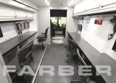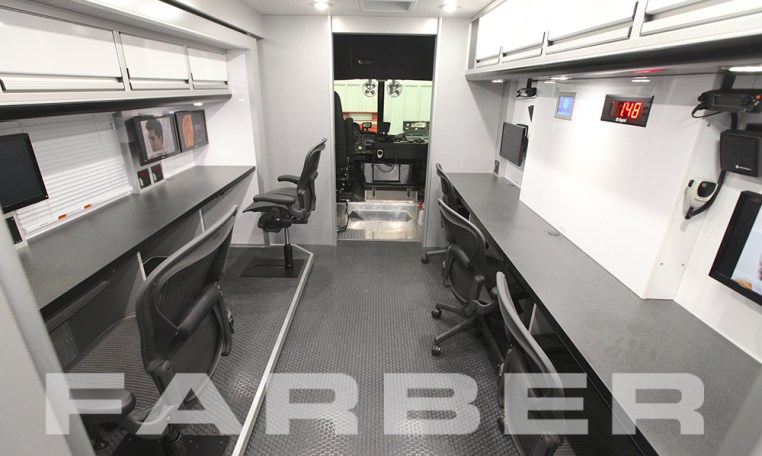 Step Van style body, 39’ overall length. Shorter models available. Freightliner chassis rated from 26,000 lb. to 30,000 lb. GVWR. Powered by Cummins diesel front engine, Allison automatic transmission. Air brakes or hydraulic brakes with optional air supply, 270 amp alternator. Power heated mirrors, power steering, cruise control, tilt telescoping steering column, automotive air conditioning, polished aluminum front and outer rear wheels, daytime running lights. Custom interior with 96” interior finished width, flat interior floor, LED lighting, commercial flooring, exterior underfloor storage compartments. One piece pitched radius roof. Custom aluminum cabinetry.