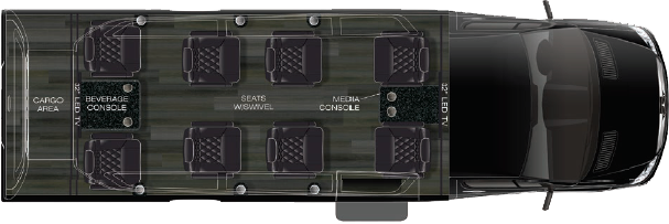 Travel in luxury, comfort and style. Behind the captain seats there is a dinette that converts to a bed when desired. At the rear, there is a cassette style toilet isolated from view with a bi-fold door when not in use. Refrigerator, microwave and galley sink are optional.